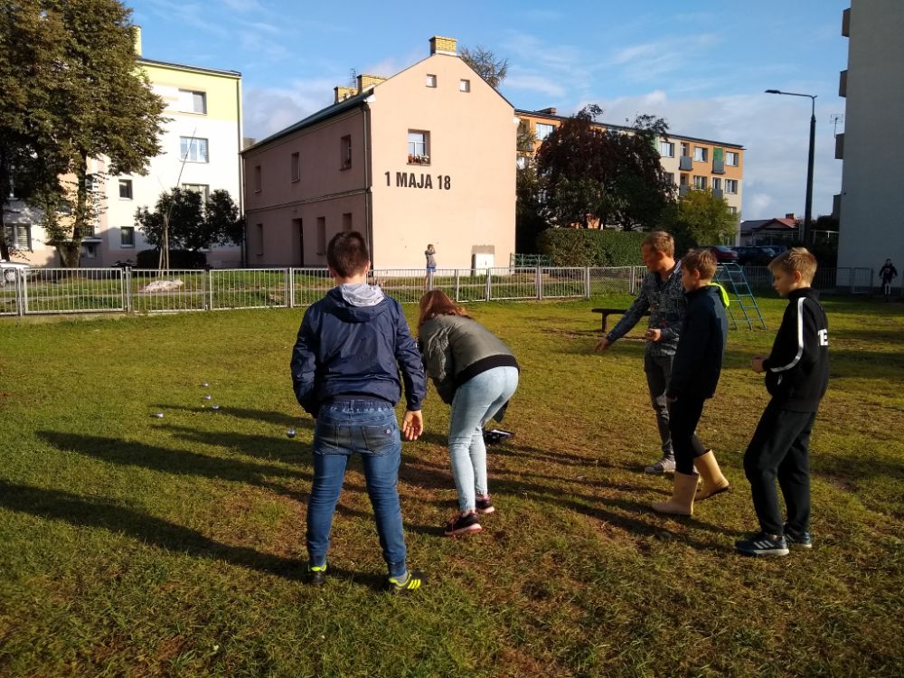 Październik rozpieszczał nas ciepłą pogodą. Spotykaliśmy się prawie zawsze dwa razy w tygodniu. Regularnie graliśmy w zbijaka na trzy kroki, w chińczyka, do którego planszę i pionki przygotowaliśmy samodzielnie. Dokupiliśmy sporo sprzętu sportowego: paletki do badmintona, planszę do balansowania, różnego rodzaju piłki i gry drużynowe. Było bardzo aktywnie Poza tym hitem października były też tosty z ostrym keczupem lub z nutellą. Dzieci angażowały się bardzo w przygotowanie ciepłych kanapek dla innych.